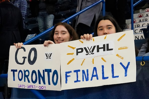 Fans hold up signs before the inaugural PWHL ice hockey game between New York and Toronto at Mattamy Athletic Centre in Toronto, on Jan. 1.John E. Sokolowski/Reuters