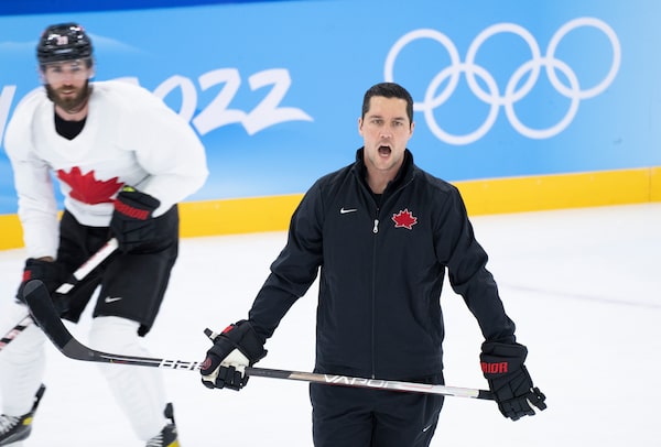 Team Canada assistant coach Nolan Baumgartner directs a team practice at the 2022 Winter Olympics, in Beijing, on Feb. 5, 2022. The Ottawa Senators announced on Tuesday that Baumgartner has been added to the team's coaching staff.Paul Chiasson/The Canadian Press