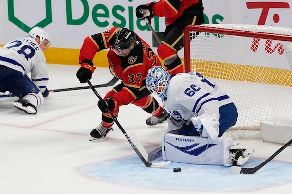 Ottawa Senators forward Warren Foegele is stopped by Toronto Maple Leafs goaltender Joseph Woll during their game in Ottawa on Saturday.Justin Tang/The Canadian Press