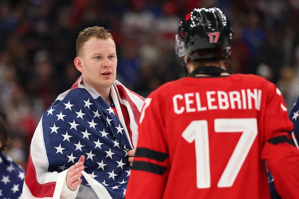 Brady Tkachuk shakes hands with Macklin Celebrini of Team Canada after the U.S.'s 2-1 win.Gregory Shamus/Getty Images