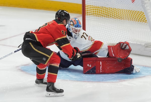 Florida Panthers goaltender Sergei Bobrovsky (72) makes a glove save on Ottawa Senators centre Tim Stützle (18) during second period NHL action in Ottawa on Thursday.Adrian Wyld/The Canadian Press