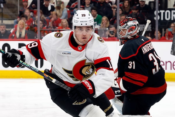 Ottawa Senator Drake Batherson (19) chases the puck with Carolina Hurricanes goaltender Frederik Andersen (31) nearby during Game 1 of their first-round playoff series in Raleigh, N.C. on Saturday.Karl B DeBlaker/The Associated Press
