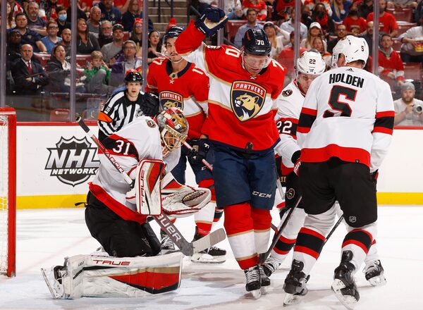 Goaltender Anton Forsberg #31 of the Ottawa Senators stops a shot with Patric Hornqvist #70 of the Florida Panthers in front of the net in the first period at the FLA Live Arena on March 3, 2022 in Sunrise, Fla.Joel Auerbach/Getty Images