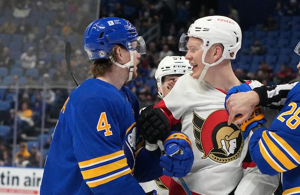 Bowen Byram of the Buffalo Sabres and Brady Tkachuk of the Ottawa Senators in a scrum during the second period at KeyBank Center. The Sabres won 6-2 on March 27, 2024 in Buffalo.Kevin Hoffman/Getty Images