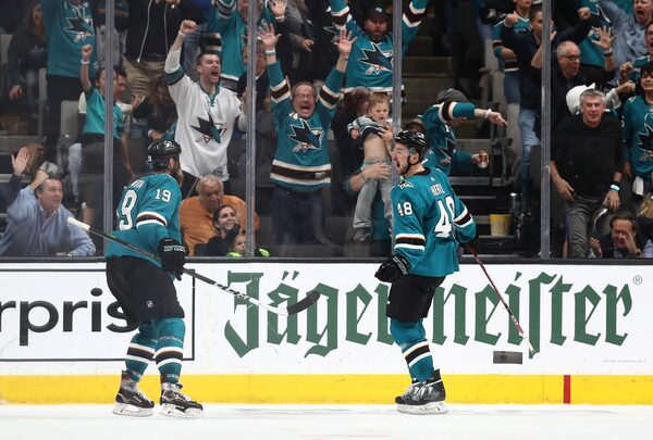 Tomas Hertl of the San Jose Sharks, right, celebrates with teammate Joe Thornton after he scored his second goal of the night in Game Five of the Western Conference First Round during the 2019 NHL Stanley Cup Playoffs at SAP Center in San Jose on April 18, 2019.Ezra Shaw/Getty Images