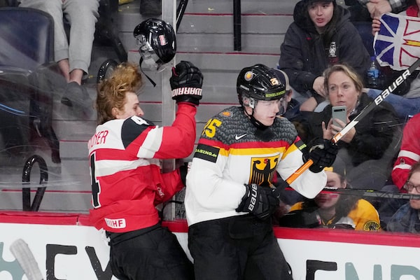 Austria’s Lorenz Lindner, left, has his helmet knocked off by Germany’s Robin van Calster during second period IIHF World Junior Hockey Championship action in Halifax. Germany won 4-2 on Dec. 30, 2022.Darren Calabrese/The Canadian Press