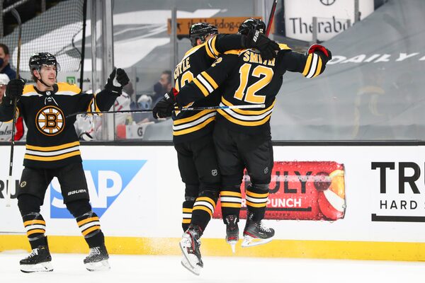 Craig Smith of the Boston Bruins reacts with teammates after scoring the game-winning goal in double overtime against the Washington Capitals in Game 3 of the first round of the 2021 Stanley Cup Playoffs at TD Garden on May 19, 2021 in Boston. The Bruins won 3-2 to take a 2-1 series lead.Adam Glanzman/Getty Images