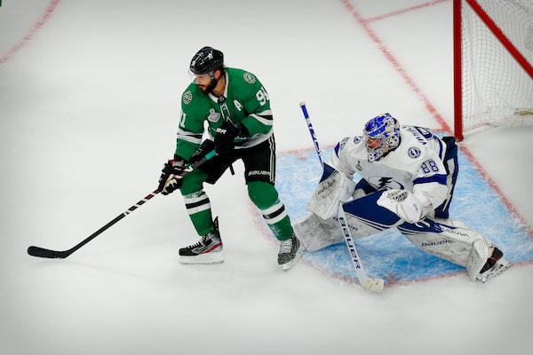 Dallas Stars centre Tyler Seguin screens Tampa Bay Lightning goaltender Andrei Vasilevskiy during the third period in Game 3 of the 2020 Stanley Cup Final on Sept. 23, 2020. The Lightning won 5-2.Perry Nelson/USA TODAY Sports via Reuters