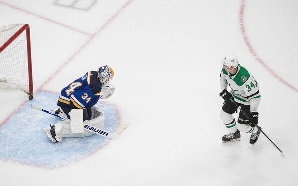 St. Louis Blues goalie Jake Allen (34) is scored on by Dallas Stars' Denis Gurianov (34) during shootout NHL qualifying round game action in Edmonton, on Sunday, Aug. 9, 2020.JASON FRANSON/The Canadian Press