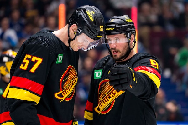 Vancouver Canucks forward J.T. Miller, right, and defenseman Tyler Myers talk during a stop in play against the Dallas Stars in the third period at Rogers Arena. Dallas won 3-1 on March 28, 2024.Bob Frid/Reuters