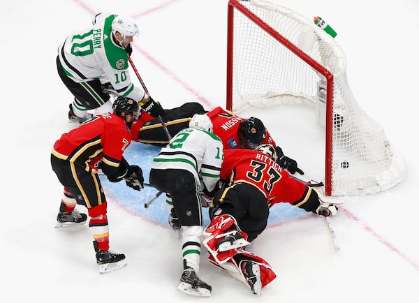 Radek Faksa of the Dallas Stars scores on the power-play against David Rittich of the Calgary Flames at 5:47 of the second period in Game Six of the Western Conference First Round at Rogers Place in Edmonton on Aug. 20, 2020.Jeff Vinnick/Getty Images