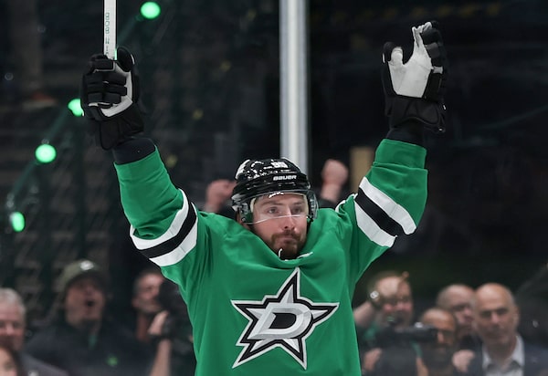 Matt Duchene of the Dallas Stars celebrates after scoring a goal against the Edmonton Oilers during the third period in Game 1 of the Western Conference Final at American Airlines Center. The Stars won 6-3 on May 21, 2025, in Dallas.Sam Hodde/Getty Images