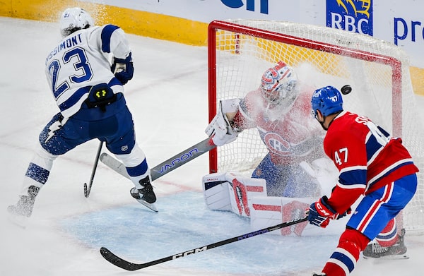 Tampa Bay Lightning's Michael Eyssimont scores against Montreal Canadiens goaltender Cayden Primeau as defenceman Jayden Struble defends during the first period in Montreal. The Lightning won 7-4 on April 4, 2024.Graham Hughes/The Canadian Press
