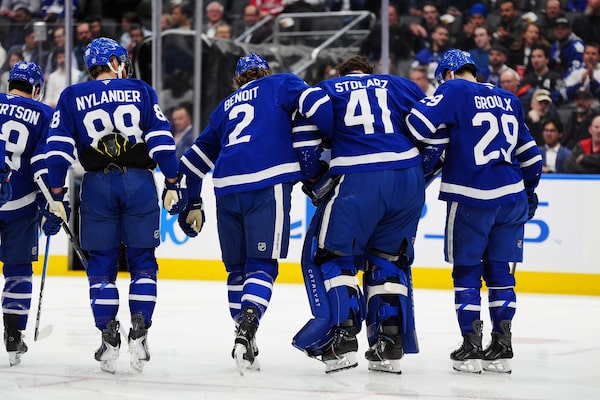 Maple Leafs goaltender Anthony Stolarz (41) is helped off the ice by teammates following an injury against the Washington Capitals in Toronto on Wednesday.Frank Gunn/The Canadian Press