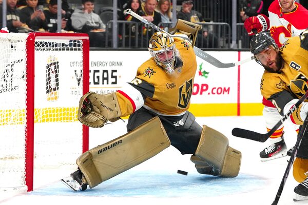 Vegas Golden Knights goaltender Logan Thompson attempts to make a save against the Calgary Flames during the first period at T-Mobile Arena. The Golden Knights won 5-4 in overtime on Dec. 12, 2023.Stephen R. Sylvanie/Reuters