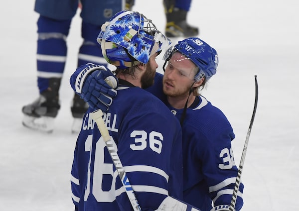 Toronto Maple Leafs goalie Jack Campbell (36) is consoled by defenseman Rasmus Sandin (38) after losing to the Montreal Canadiens in game seven of the first round of the 2021 Stanley Cup Playoffs.Dan Hamilton/USA TODAY Sports via Reuters