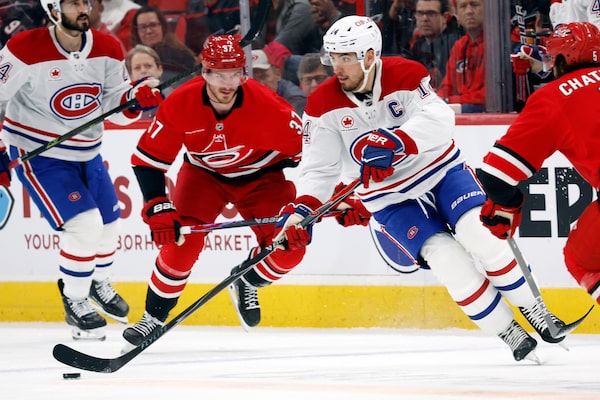Montréal Canadiens' captain Nick Suzuki (14) controls the puck against the Carolina Hurricanes during the first period of their game in Raleigh, N.C., on Sunday.Karl B Deblaker/The Associated Press