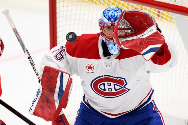 Montreal Canadiens goaltender Jakub Dobes watches the puck during the third period against the Washington Capitals. The Canadiens won 3-2 in overtime on Jan. 10, 2025, in Washington.Nick Wass/The Associated Press