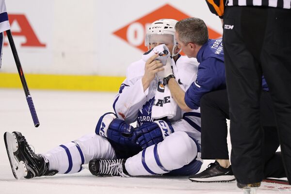 Morgan Rielly is tended to after being hit by a slapshot during Game 7 against the Bruins on Wednesday.Maddie Meyer/Getty Images