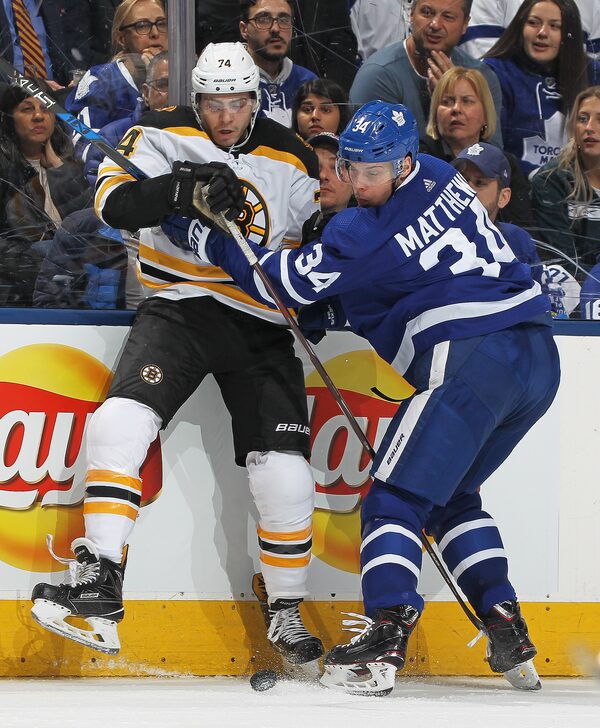 Jake DeBrusk of the Bruins battles against Auston Matthews during Game 4 of their series.Claus Andersen/Getty Images
