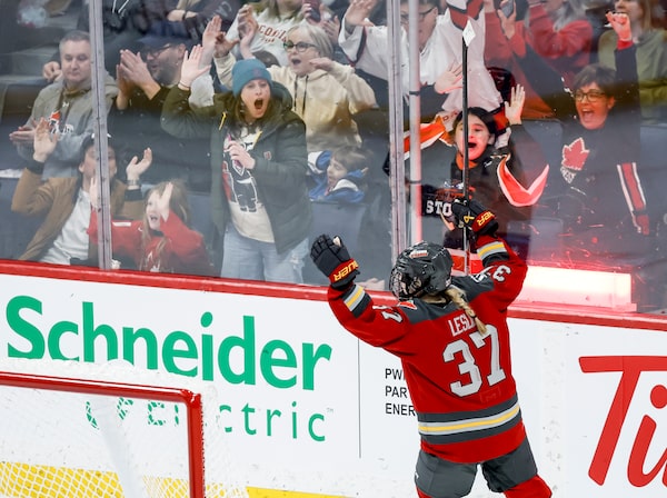 The Ottawa Charge's Rebecca Leslie (37) celebrates scoring the game-winning goal against the Montreal Victoire in overtime in Winnipeg on Sunday.JOHN WOODS/The Canadian Press