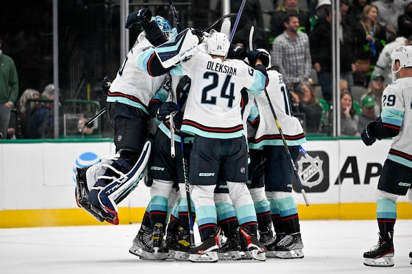 Seattle Kraken goaltender Joey Daccord (35) and defenceman Jamie Oleksiak (24) celebrate after defenceman Adam Larsson (6) scores the game-winning goal against the Dallas Stars during the overtime period at the American Airlines Center, in Dallas, Texas, on March 21.Jerome Miron/USA TODAY Sports via Reuters