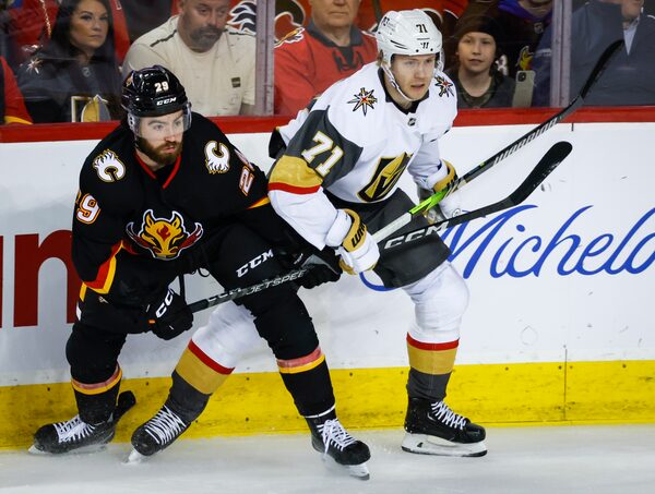 Vegas Golden Knights forward William Karlsson, right, is checked by Calgary Flames forward Dillon Dube during the first period in Calgary. The Golden Knights won 3-2 on March 23, 2023.Jeff McIntosh