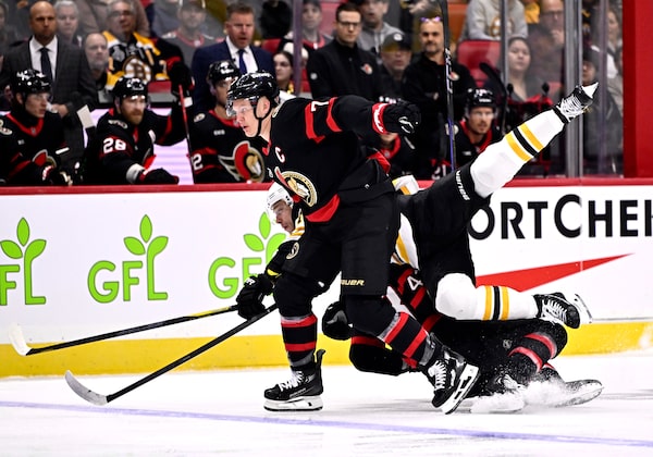 Boston Bruins' Charlie Coyle (13) falls after crashing into Ottawa Senators' Brady Tkachuk (7) and Tyler Kleven (43) during first period NHL hockey action in Ottawa on Jan. 18.Justin Tang/The Canadian Press