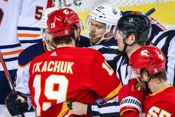 Edmonton Oilers centre Connor McDavid and Calgary Flames left wing Matthew Tkachuk exchange words during the first period in Game 1 of the second round of the 2022 Stanley Cup Playoffs at Scotiabank Saddledome. The Flames won 9-6 on May 18, 2022.Sergei Belski/USA TODAY Sports via Reuters