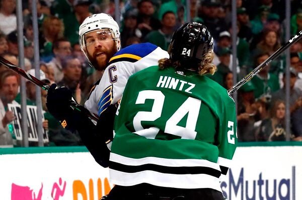 St. Louis Blues' Alex Pietrangelo is checked by Dallas Stars' Roope Hintz, of Finland, during the first period in Game 4 on Wednesday, May 1, 2019, in Dallas.The Associated Press