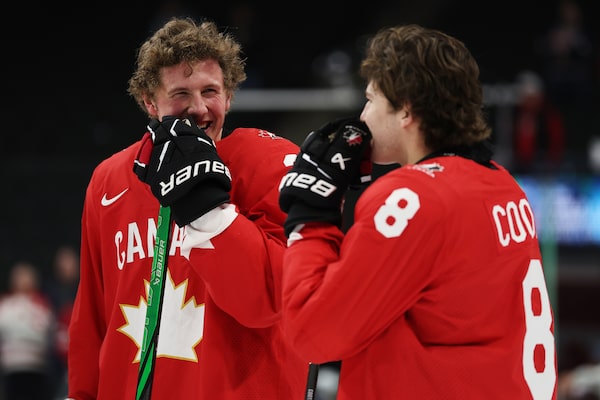 Canadian defenceman Keaton Verhoeff, left, and forward Braeden Cootes (8) after winning bronze at the world junior hockey championship in St. Paul, Minn. in January.Matt Krohn/The Associated Press