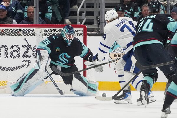 Seattle Kraken goaltender Joey Daccord blocks a shot from Toronto Maple Leafs centre Bobby McMann in Seattle on Thursday.Lindsey Wasson/The Associated Press