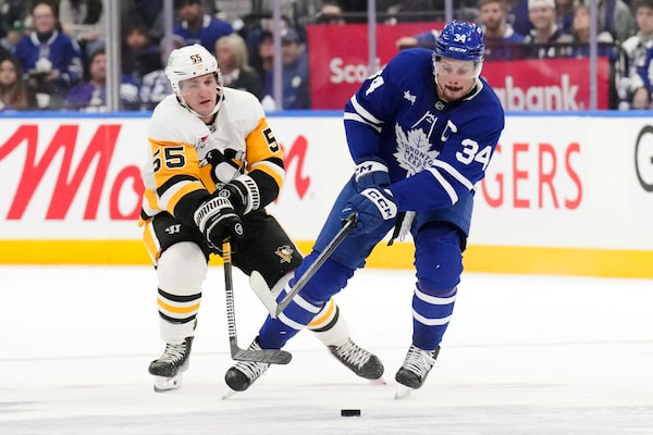 Toronto Maple Leafs' Auston Matthews brings the puck past Pittsburgh Penguins Noel Acciari during second period NHL hockey action in Toronto, on Saturday, Oct. 12.Chris Young/The Canadian Press