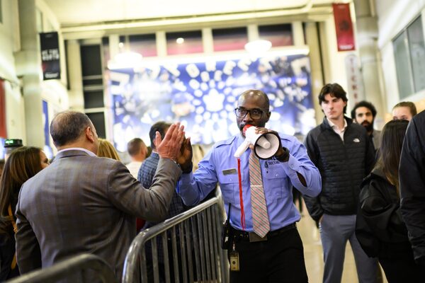 He directs some fans to a different gate.