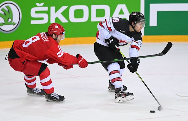 Canada's forward Andrew Mangiapane, right, and Russia's forward Ivan Morozov vie during the IIHF Men's Ice Hockey World Championships quarter final match between Russia and Canada, at the Olympic Sports Center in Riga, Latvia, on June 3, 2021.GINTS IVUSKANS/AFP/Getty Images