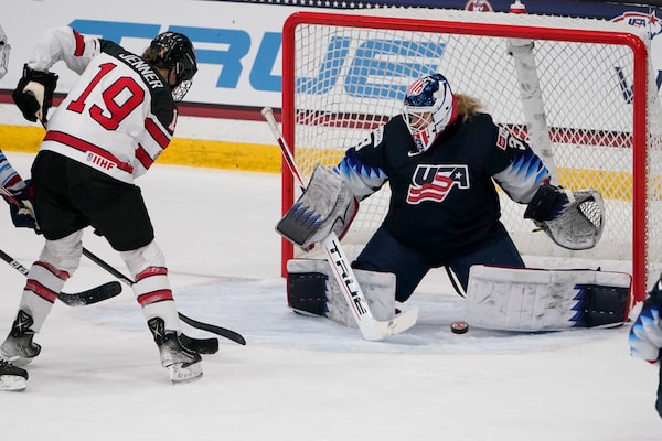 United States goalie Alex Cavallini stops a shot from Canada's Brianne Jenner during the second period of a women's exhibition hockey game on Dec. 15, in Maryland Heights, Mo.Jeff Roberson/The Associated Press