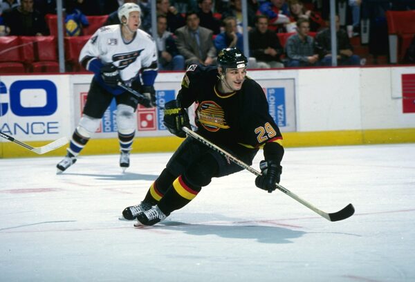 Leftwinger Gino Odjick of the Vancouver Canucks looks on during a game against the St. Louis Blues at General Motors Place in Vancouver on Feb. 29, 1996.Glenn Cratty/Allsport/Getty Images