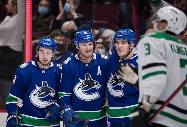 Vancouver Canucks' Quinn Hughes, from left to right, J.T. Miller and Bo Horvat celebrate Miller's goal against the Dallas Stars during the second period of an NHL hockey game in Vancouver on Sunday, Nov. 7, 2021.DARRYL DYCK/The Canadian Press