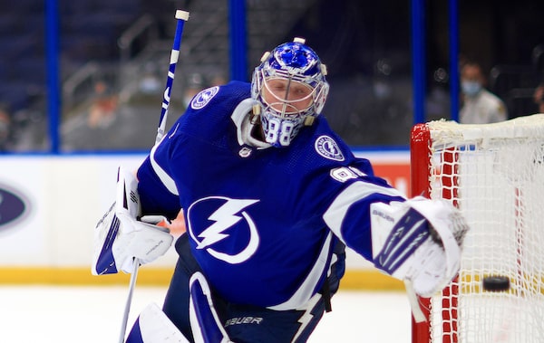 Andrei Vasilevskiy of the Tampa Bay Lightning makes a save during Game 6 against the Florida Panthers at Amalie Arena on May 26, 2021 in Tampa, Fla. The Lightning beat the Panthers 4-0.Mike Ehrmann/Getty Images