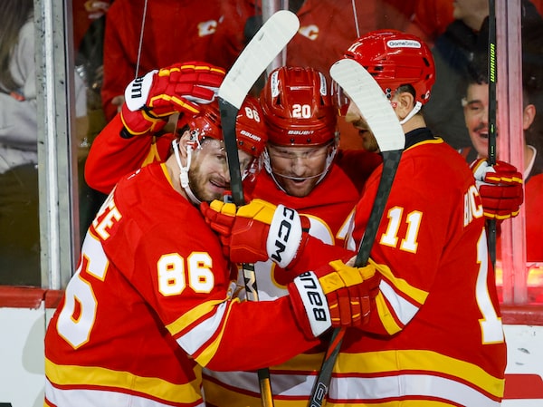Calgary Flames' Joel Farabee, left, celebrates his goal with teammates Blake Coleman, centre, and Mikael Backlund during NHL hockey action against the Florida Panthers in Calgary on Friday.Jeff McIntosh/The Canadian Press