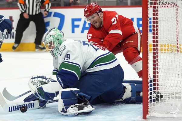 Vancouver Canucks goaltender Casey DeSmith (29) stops a Detroit Red Wings right wing Christian Fischer (36) shot in the first period of an NHL hockey game Saturday, Feb. 10, 2024, in Detroit.Paul Sancya/The Associated Press