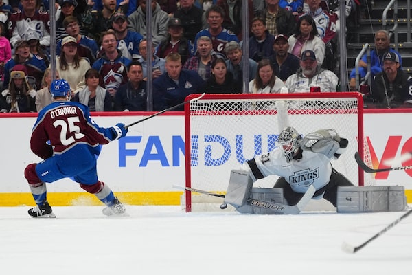 Colorado Avalanche right wing Logan O'Connor (25) scores against Los Angeles Kings goaltender Anton Forsberg (31) during Game 1 of the first round of the NHL playoffs on Sunday in Denver.Jack Dempsey/The Associated Press