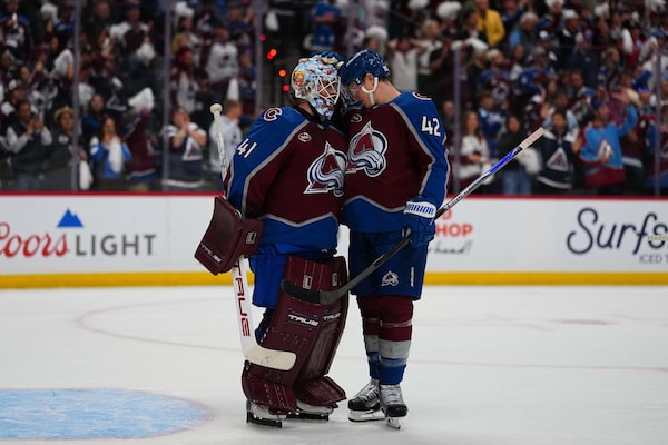 Colorado Avalanche goaltender Scott Wedgewood (41) celebrates after a win over the Los Angeles Kings with teammate Josh Manson (42) on Sunday.Jack Dempsey/The Associated Press