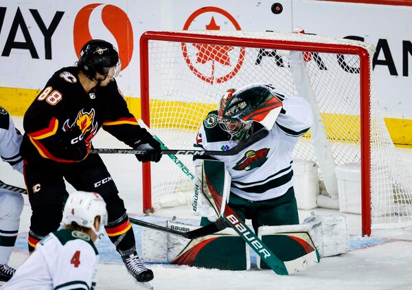 Minnesota Wild goalie Filip Gustavsson, right, deflects the puck over the net as Calgary Flames forward Andrew Mangiapane looks on during second period NHL hockey action in Calgary, on March 4.The Canadian Press