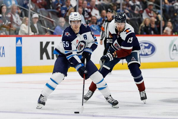 Winnipeg Jets center Mark Scheifele controls the puck ahead of Colorado Avalanche right wing Valeri Nichushkin in the third period at Ball Arena on April 13.Isaiah J. Downing/Reuters