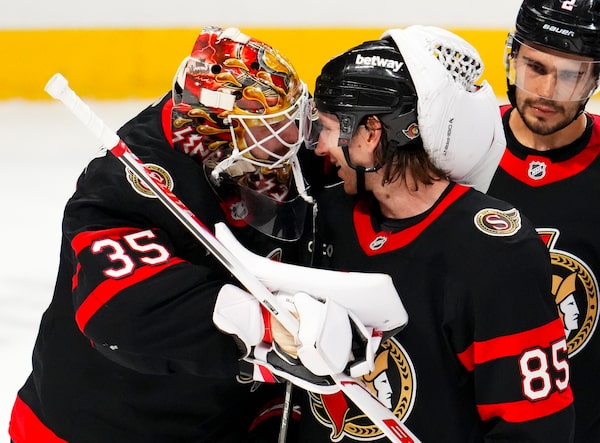 Goaltender Linus Ullmark (35) and defenceman Jake Sanderson celebrate a win over the Tampa Bay Lightning on April 7 that helped cement the Senators' playoff spot.Sean Kilpatrick/The Canadian Press