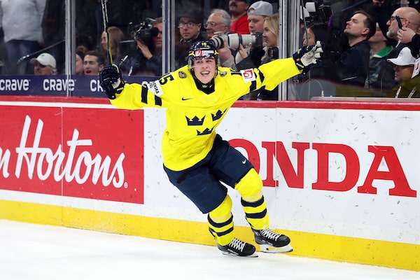 Ivar Stenberg of Sweden celebrates his empty-net goal against Czechia in the third period of the Gold medal game of the IIHF World Junior Hockey Championship at Grand Casino Arena on Monday in St Paul, Minn.David Berding/Getty Images