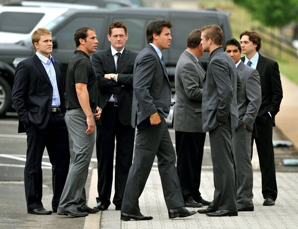 Nashville Predators players and staff including Colin Wilson, left, David Legwand, second left, Shea Weber, center, talk before a memorial service for former Predators NHL hockey player Wade Belak on Sunday, Sept. 4, 2011 in Nashville, Tenn. Belak was found dead Wednesday in a Toronto hotel and condo. AP Photo/Christopher Berkey)CHRISTOPHER BERKEY/AP Photo/The Associated Press