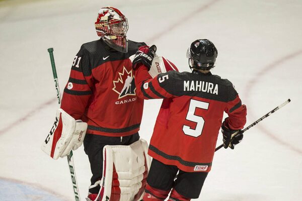 Goaltender Carter Hart is congratulated by defenceman Josh Mahura after earning the shutout in a 9-0 Team Canada victory over the Czech Republic in a pretournament game in London, Dec. 20, 2017.Geoff Robins/The Globe and Mail