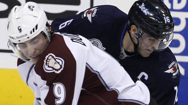 Colorado Avalanche's Matt Duchene (9) puts a hard check into Winnipeg Jets' Andrew Ladd (16) during second period NHL hockey action in Winnipeg, Sunday, February 19, 2012. The Jets won 5-1. THE CANADIAN PRESS/Trevor HaganTrevor Hagan/The Canadian Press